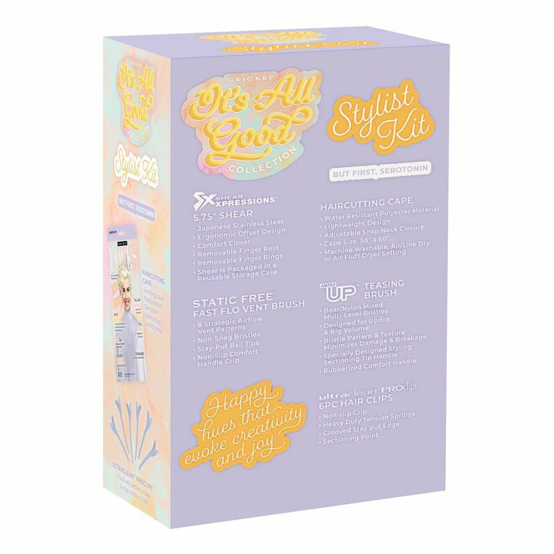 Itโs All Good But First, Serotonin Stylist Kitย comes in a happy lavender hue that evokes creativity and hairstyling joy? This Stylist Kit includes one of each tool in the NEW It’s All Good Collection’sย But First, Serotonin soft lavender color: Shear Xpressionsโข 5.75โ Shear, Haircutting Cape, Static Freeโข Fast Flo Vent Brush, Amped Upโข Rubberized Teasing Brush and Ultracleanโข ProClipsโข.