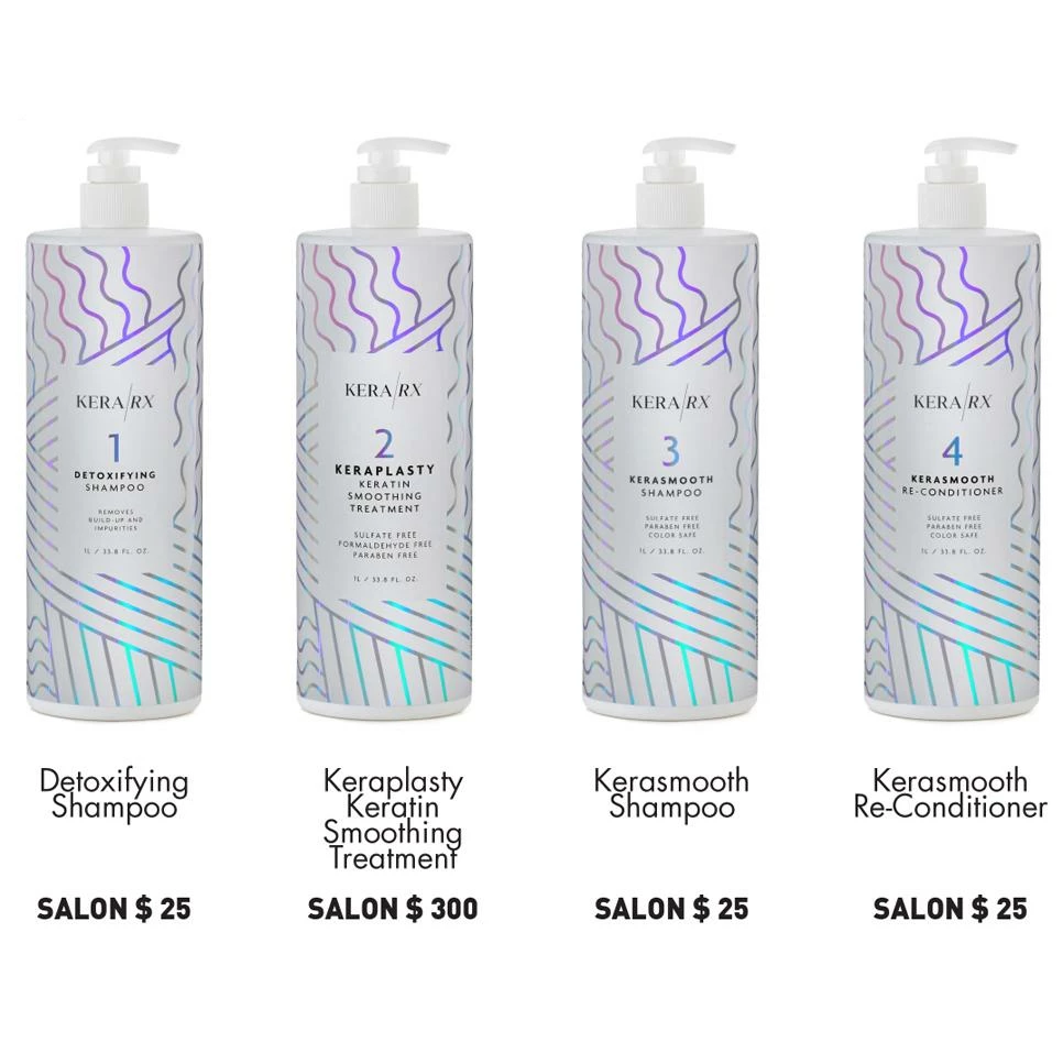 Utilizes our newest color-safe protective system, specially formulated to extend the life of your color and/or keratin treatment by depositing hydrolyzed nano-keratin, Omega-3’s, antioxidants, strengthening vitamins and botanicals, as well as soy, whole wheat, oat, and quinoa proteins into the hair shaft in order to repair damage, smooth the cuticle, protect the hair from heat/UV rays, and to optimize the longevity of the KeraRX Smoothing Treatment .