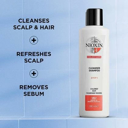 Prepare the scalp and hair for a complete hair thickening treatment with Nioxin’s 3-part System 4 Cleanser for Colored Hair with Progressed Thinning. Thanks to its Pro-Color Shield technology, this professional hair product helps remove sebum, fatty acids and other environmental residue from the scalp and hair. Nioxin’s derma-purifying shampoo deeply cleanses the scalp and provides thicker, fuller-looking hair. Nioxin’s cleanser is the first step of a 3-part Nioxin regimen, designed to strengthen the hair and amplify hair structure.