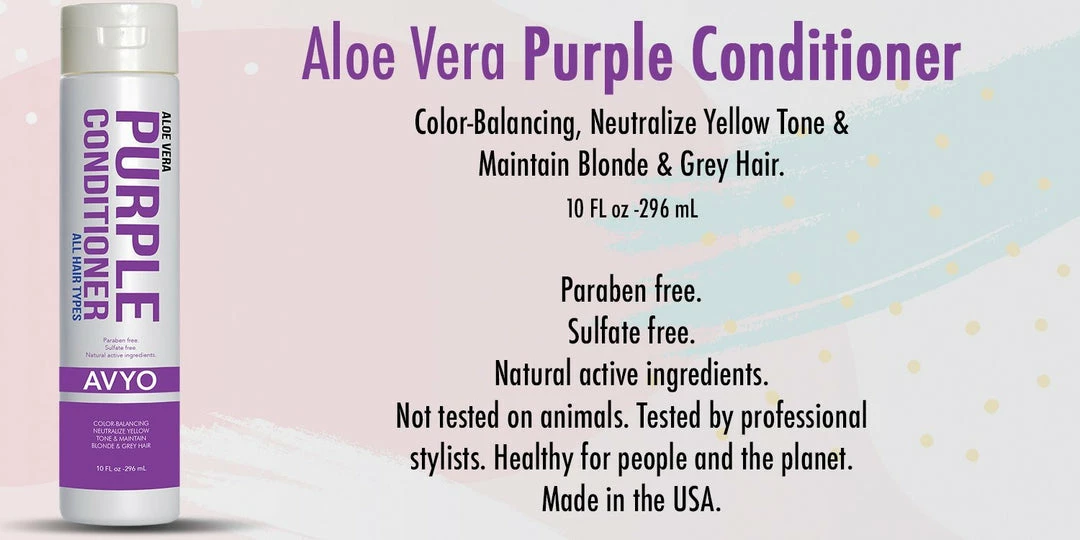 Direcciones: Después de usar AVYO Purple Shampoo, secar con toalla. Aplicar una pequeña cantidad de AVYO Purple Conditioner en el cabello y cepillar. Dejar en el cabello por 2 o 3 minutos. Para un depositio de color mas profundo, poner bajo la secadora por 5 minutos. Enjuagar bien.